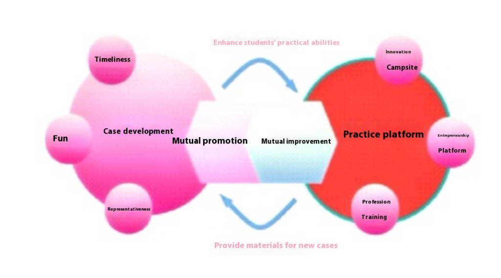 The relationship between case develop-ment and practice platforms,the two cores,isclosely connected and mutually promoting:through effective case teaching,students’en-trepreneurial combat abilities can be signifi-cantly improved,allowing them to play a great-er role in practice platforms.Conversely,thebusiness achievements,successful experienc-es,and failure lessons obtained by students inpractice platforms provide valuable first-handmaterials for writing new cases.The relation-ship between case development and practiceplatforms,the two cores,is detailed in Figure1.
