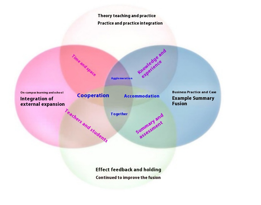 Quadruple fusion refers to the integrationof theoretical teaching and practical exercisesin innovation and entrepreneurship education,the integration of business operations andcase summaries,the integration of on-campuslearning and off-campus expansion,and the