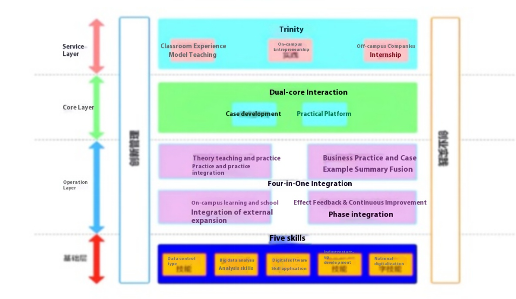 In response to the above issues and tomeet the requirements of the digital economyera,a new paradigm for talent cultivation ininnovation and entrepreneurship educationshould be established,characterized by”du-al-core driven,trinity integration,quadruplefusion,and quintuple skills,”to ensurehigh-quality innovation and entrepreneurshipeducation in the new era.Below,the specificreform ideas and measures for the four aspects