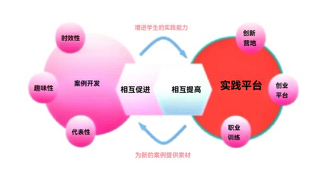 案例开发与实践平台这两个核心之间的关系紧密相连、相互促进:通过有效的案例教学,能够显著提升学生的创业实战能力,使其在实践平台上发挥更大的作用。反之,学生在实践平台上取得的业务成果、成功经验和失败教训,为编写新案例提供了宝贵的第一手资料。案例开发与实践平台这两个核心之间的关系详见图1。