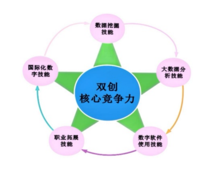 为应对数字经济发展趋势,在创新创业过程中着重培养学生五项数字经济应用技能,培育他们创新创业的核心竞争力。其一,数据挖掘技能。培养学生运用爬虫等数据分析软件开展国内外市场调研的能力,提取创新创业所需的有用数据。其二,大数据分析技能。培养学生的大数据分析能力,并基于此开展产品推广及促销活动的能力,从而提高创业盈利能力。其三,数字软件操作技能。培养学生熟练进行网站创建与维护、移动微网站以及 APP 开发与使用的能力。其四,职业拓展技能。鼓励学生获取与数字贸易相关的职业技能证书,拓展 1+X 证书范围,以便在创新创业平台上具备强大的知识更新和职业拓展技能。其五,国际化数字技能。培养学生灵活运用国际社交平台推广产品的能力。
