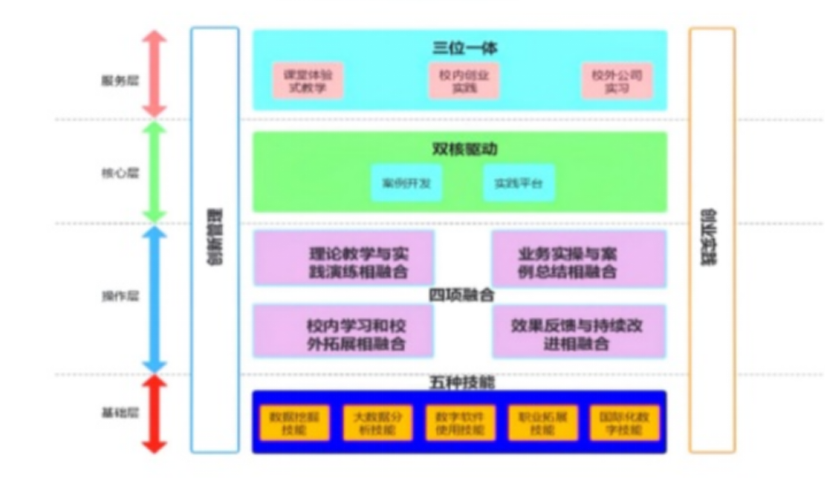 针对上述问题,为满足数字经济时代的要求,应构建创新创业教育人才培养的新范式,其特点为“双核驱动、三位一体融合、四方协同、五维技能”,以保障新时代创新创业教育的高质量开展。